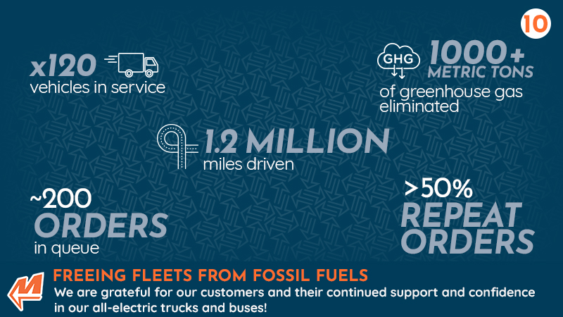 In 2020 we opened a new facility, expanded our product line, met with new customers and body builders, renewed partnerships with additional orders, and deployed more trucks and buses. Thank you for joining us on our journey to free fleets from fossil fuels!